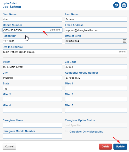 Dialog Health validates all phone numbers before they are subscribed and only “opts-in” Patients who have a valid mobile phone number in the Mobile Phone or Additional Phone Field. Once you get a valid mobile phone number added for this Patient, the ...