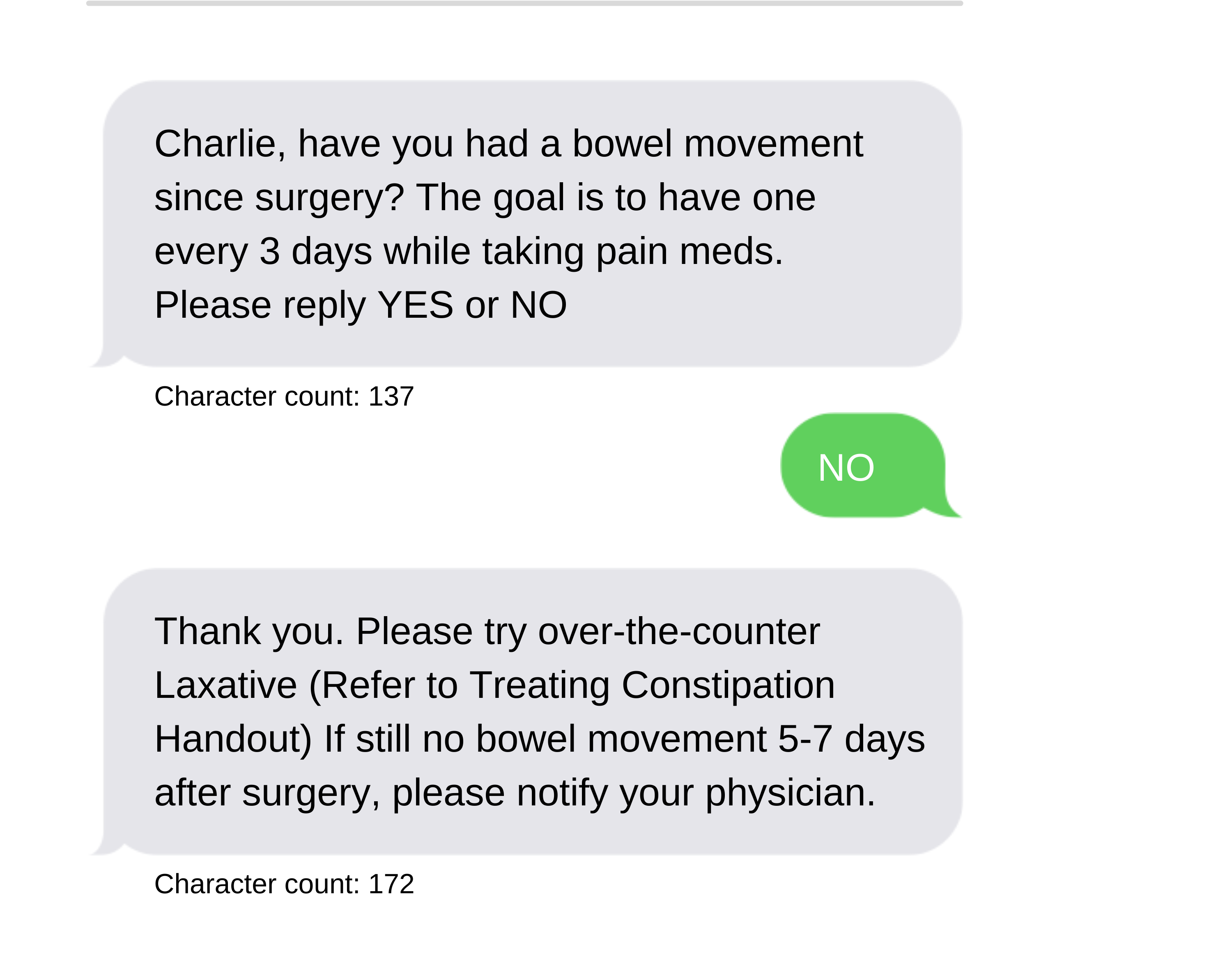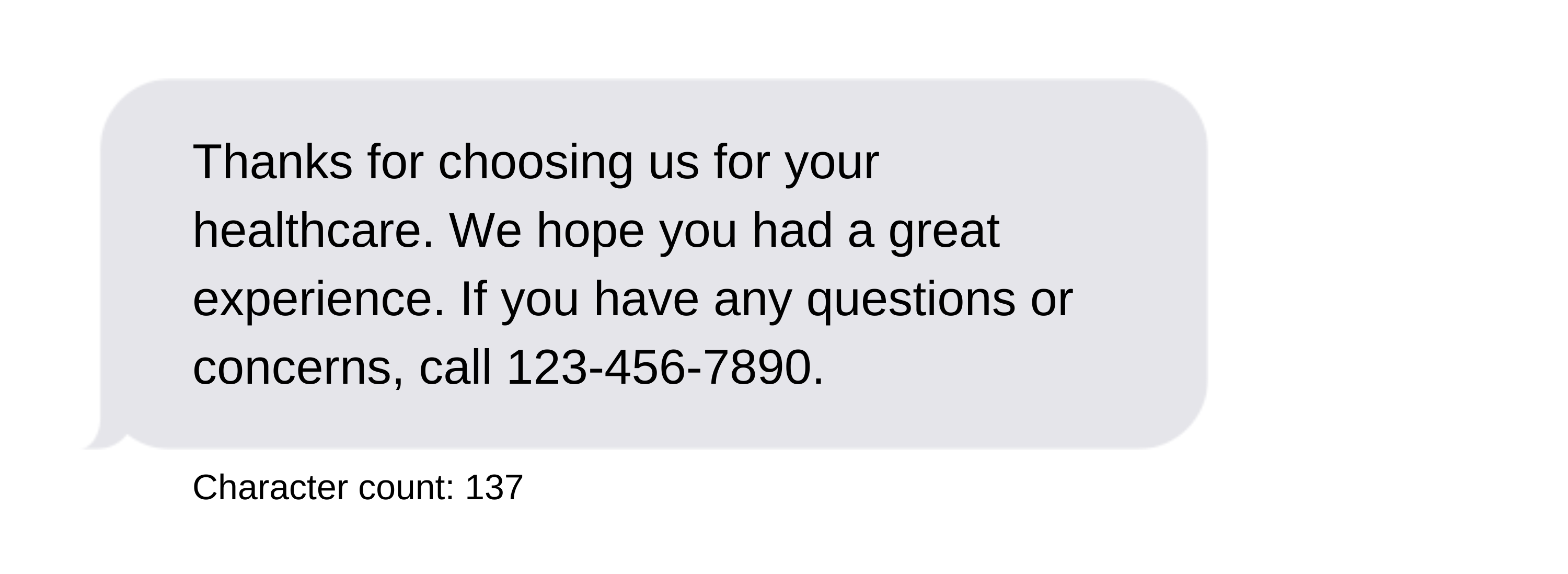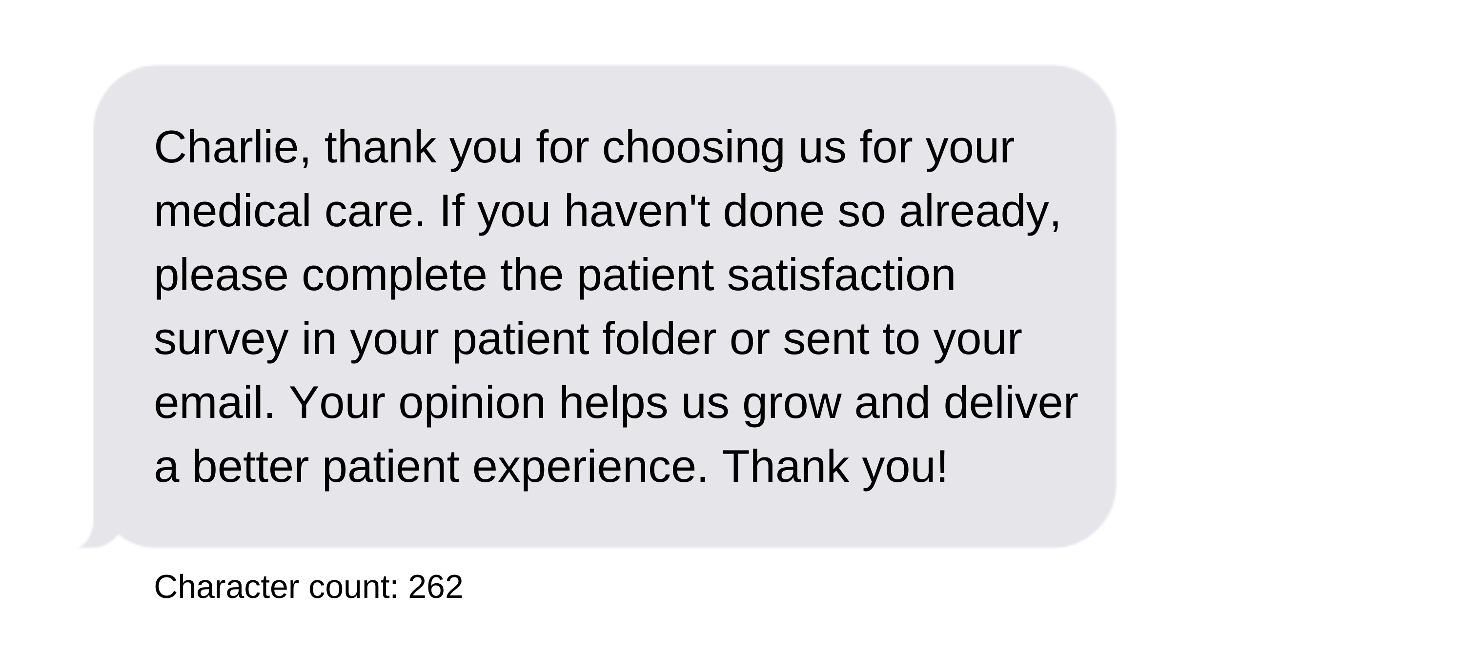 - We recommend that you include your facility name at the beginning of every outbound text message to provide clarity for your patients. For example, "Main Street Medicine: Your appointment is tomorrow at..." You can use an abbreviated facility name to conserve characters. Keep in mind, those characters are not included in the character counts below.