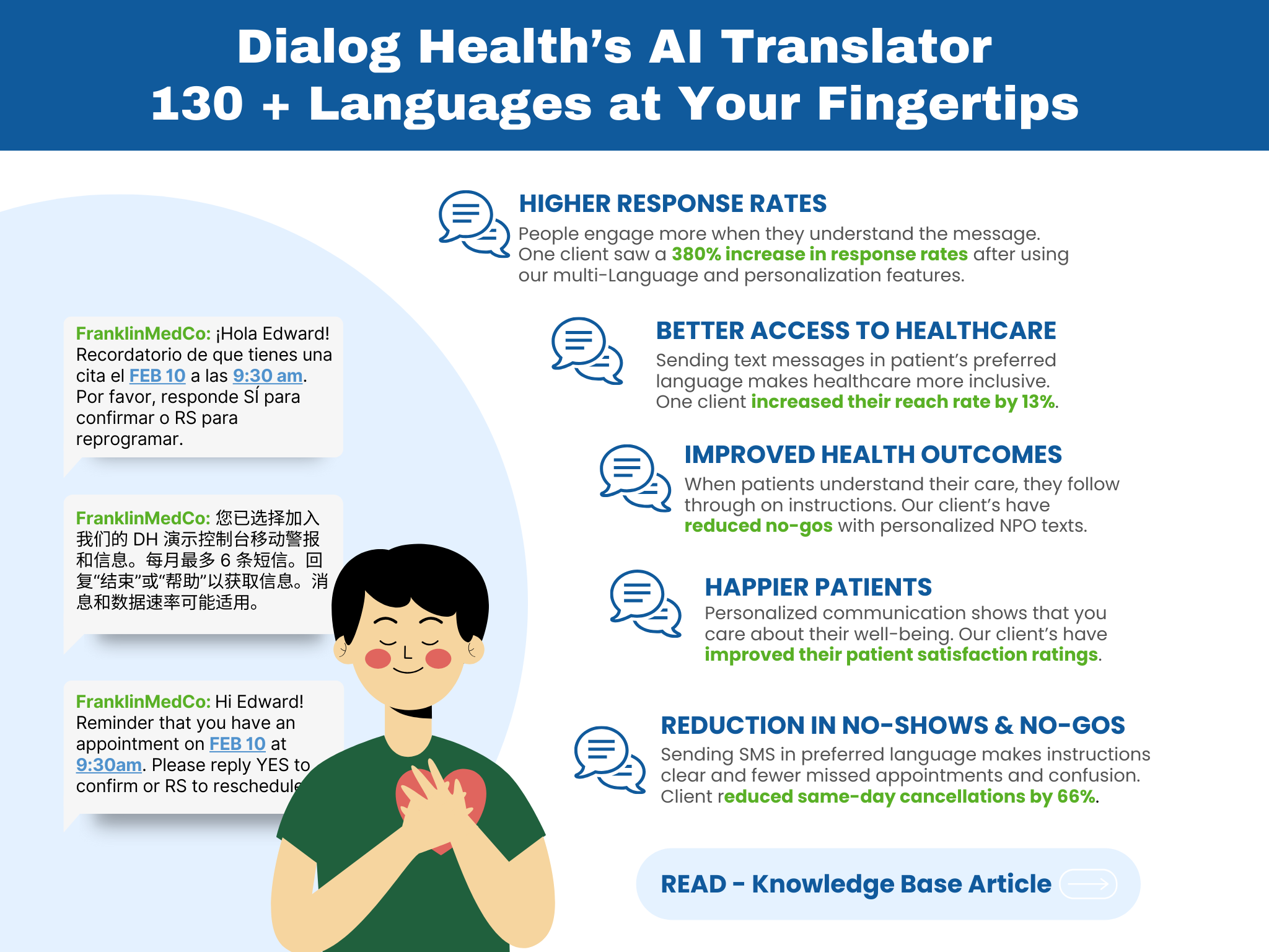 - Empower patients by messaging in the language they understand best.