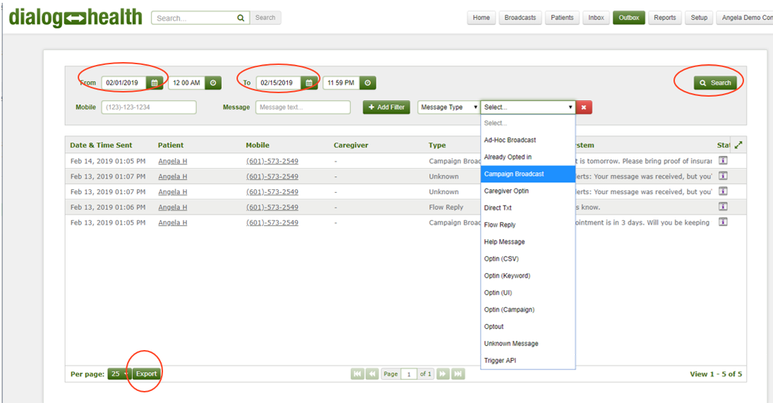 By default, the Inbox will show all messages received on the current day; however you have the ability to filter results for message text, mobile phone number, date range and/or message type. Navigate to the Inbox tab Enter a date range Select Search ...