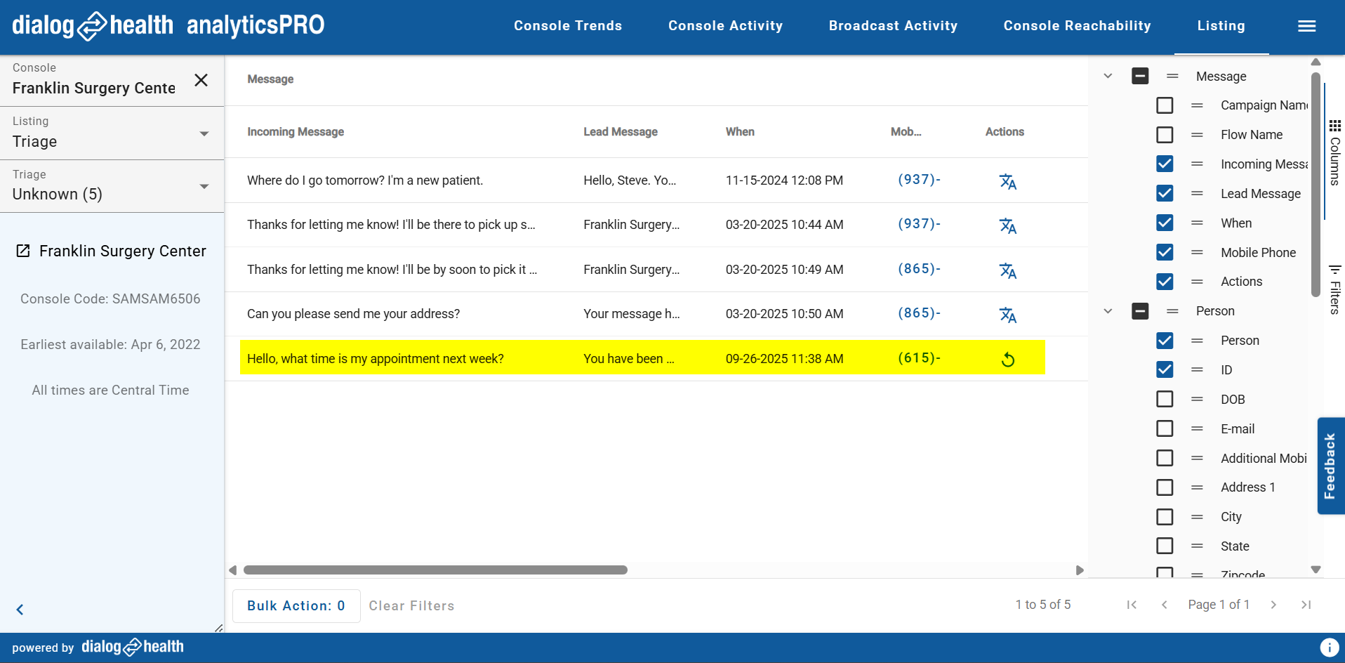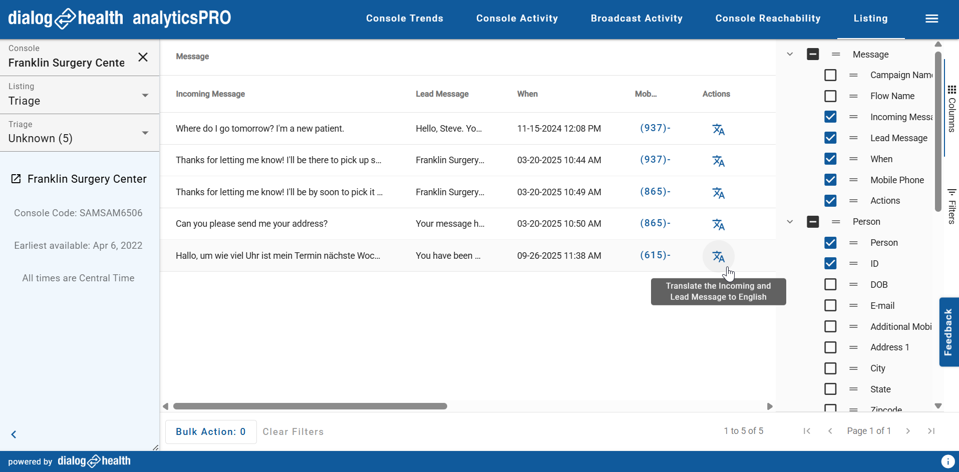 To translate incoming messages from a different language to English, select the Translation Icon found in the Actions column.